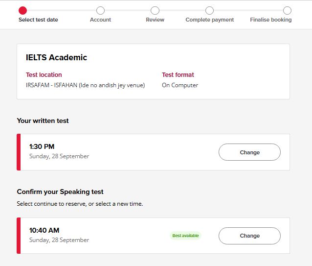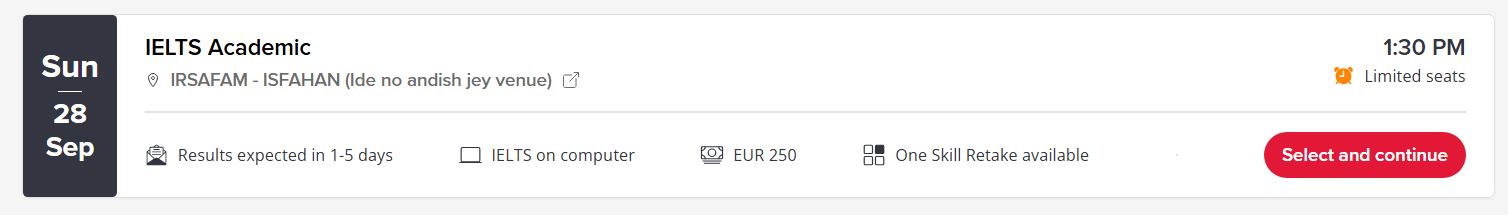 این مرحله قلب فرآیند ثبتنام است. به سایت ielts.idp.com/iran بروید. در این سایت، کشور (Iran)، شهر (Isfahan) و نوع آزمون (Academic یا General) را انتخاب کنید. تاریخ و ساعتهای موجود برای آزمون اصلی و مصاحبه شفاهی در مرکز ” IRSAFAM – ISFAHAN (Ide no andish jey venue) ” به شما نمایش داده میشود که باید زمان مورد نظر خود را رزرو کنید.