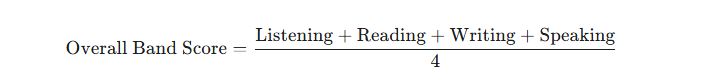 نمره کل یا Overall شما به سادگی از میانگین نمرات چهار مهارت لیسنینگ (Listening)، ریدینگ (Reading)، رایتینگ (Writing) و اسپیکینگ (Speaking) به دست میآید. وزن تأثیرگذاری هر یک از این چهار مهارت بر نمره نهایی، کاملاً یکسان است.